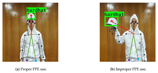 If the Euclidean distance between the position of the bounding box of and detected neck keypoint (body keypoints 1 in Figure 5a) of is smaller than the reference threshold , then the detected PPE is identified as appropriately used by the detected individual (Figure 5a); otherwise, even though PPE is associated with individual , the condition of individual is identified as not using PPE properly (Figure 5b):
