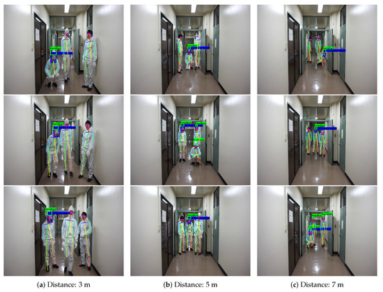 The identification results under different distances are reported in Table 4. The resolution of the individual regions in the image gradually became smaller as the distance between the camera and individuals increased. The precision and recall rate for the identification of proper hard hat use gradually decreased with increasing distance from the camera, but the precision was above 95% for all measured distances, while the recall rate was above 90% except for measurements at 7 m. The overall performance of the identification of proper hard hat use is acceptable (precision rate: 97.59%; recall rate: 89.21%). For the identification of proper full-face mask use, the performance of our approach declined only slightly as distance increased; the precision and recall rates remained higher than 97%.