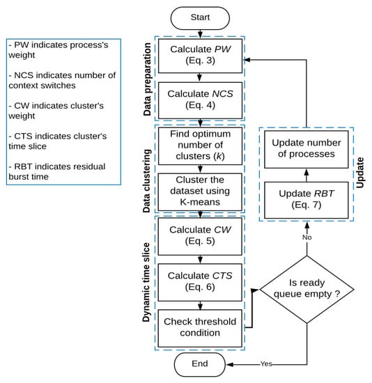 The processes’ weights and numbers of allocation to the CPU (i.e., ) depend on the processes’ burst times , which are known, and are calculated as shown in the following subsections. We assumed that all processes arrive at the same time. The main advantage of the clustering technique in the proposed work is the ability to group similar processes in clusters. Similarity between processes depends on the values of and near each other, K-means algorithm is used for this purpose. The proposed technique consists of three stages: Data preparation, data clustering, and finally, dynamic time slice implementation.