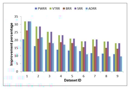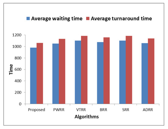 Table A2 shows a comparison of the time cost between the proposed algorithm and other algorithms in terms of average waiting time, turnaround time, and NCS. Table A3, Figure 4, and Figure 5 show the superiority of the proposed algorithm over the compared algorithms in all the datasets where the time cost of the proposed algorithm is the smallest (average waiting time and average turnaround time are 979.14 tu, 1061.36 tu respectively). Figure 6 shows how much improvement is achieved by the proposed algorithm. Unlike PWRR, BRR, and SRR which their time slices are less than or equal to the time slice defined by SRR, VTRR may behave somewhat similar to FCFS as it may give a process very long time slice. Therefore, the time slices calculated in the VTRR algorithm are restricted to be less than or equal to the time slice defined by SRR (i.e., 10 tu).