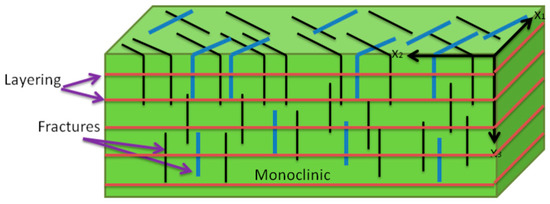 where is the number of fractures per unit volume (fracture density), is the average area of the fractures in the set, and are the (area-weighted) average specific tangential and normal compliances, and is the azimuthal angle between the fracture strike and the survey 1-axis. The subscripts 1 and 2 denote the 1st and 2nd fracture set, respectively. If the background medium is isotropic, or transversely isotropic, and there are at least two non-orthogonal vertical fracture sets, this leads to monoclinic symmetry of the fractured rock, as shown in Figure 1.