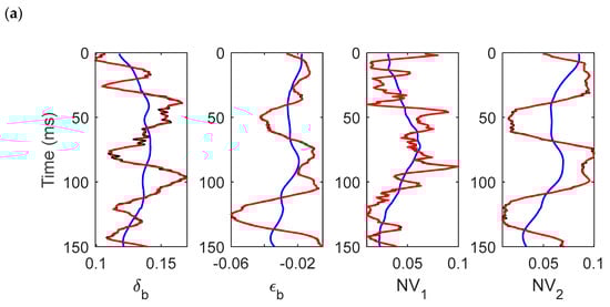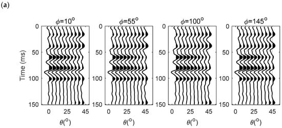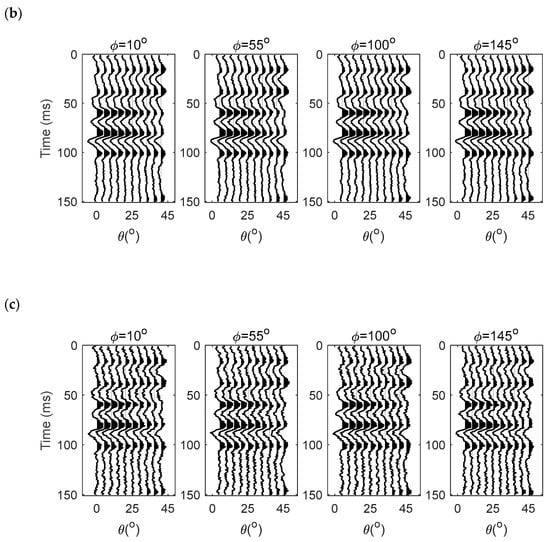 In order to test the robustness of the proposed inversion algorithm, synthetic seismic data were created by the model parameters shown in Figure 2 and Figure 3, as well as a 30 Hz Ricker wavelet, based on the derived PP-wave reflection coefficient, Equation (13), and the convolution model shown in Figure 4a. The incident angle had 10 angles between 0° and 45°, and the azimuths were 10°, 55°, 100°, and 145°.