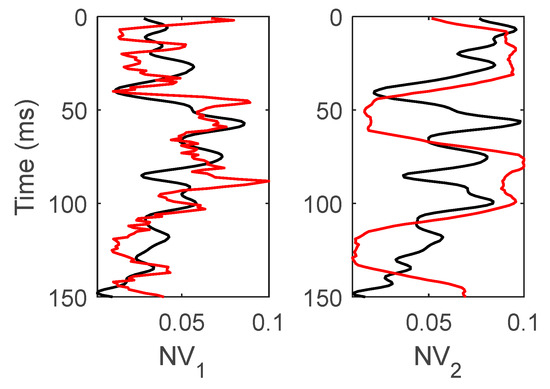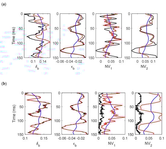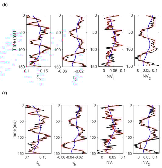 Gaussian random noises (the signal-to-noise ratios (SNRs) were 5 and 2) were added into the synthetic data, as shown in Figure 4b,c. Comparisons between the inversion results (black) of the WA parameters, the fracture density, and the true values (red) are displayed in Figure 5. We can see that, in the case of the SNR being 5, the proposed inversion method could make a stable estimation of WA parameters and fracture density; however, when the SNR was 2, the inversion results of fracture density exhibited more instabilities. Random noise had some influence on the WA parameters and fracture density, but the overall agreement was good. In general, it can be concluded that the proposed inversion method is stable and valid.