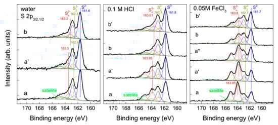 X-ray photoelectron S 2p spectra of particulate chalcopyrite conditioned in water, 0.1 M HCl, and 0.05 M FeCl3 + 0.01 M HCl, centrifuged, fast-frozen and measured at −160 °C (a, a′), −40 °C (a″), and +25 °C (b, b′). The spectra a′ and b′ measured employing an electron flood gun. Reproduced from [67] with permission from ACS.