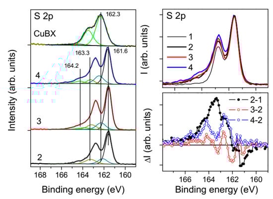 Cryo-XPS S 2p spectra from fast-frozen sphalerite (1) ground, (2) reacted with 0.1 mM CuSO4, the activated mineral treated with (3) 0.1 mM KBX and (4) 10 mM KBX. Right panels show the bands, normalized by the height and shifted to align the peak position, and the differences between the spectra. For clarity, only S 2p3/2 components are shown in the S 2p spectra fitting. Reproduced from [102] with permission from Elsevier.