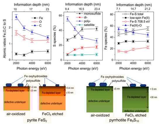 Atomic ratios and the results of fitting of the S 2p and Fe 2p spectra as a function of excitation photon energy for pyrrhotite leached in acidic 0.5 M FeCl3 solution (top panels), and scheme illustrating layered structures of pyrite and pyrrhotite oxidized in air and the aqueous solution as derived from HAXPES and XANES. Adapted from [88] with permission from Elsevier.