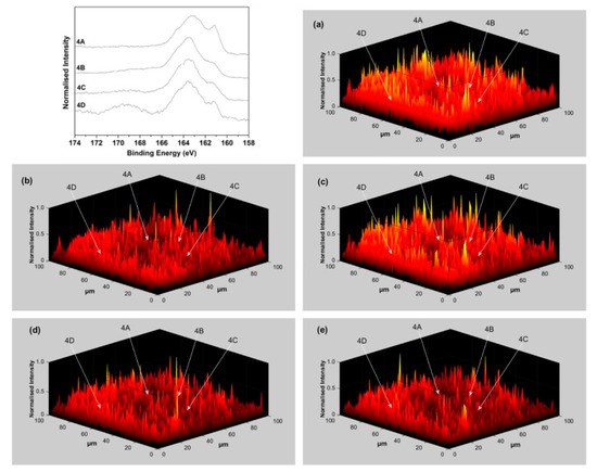 S 2p SPEM speciation maps (a) S2−, (b) S22−, (c) Sn2−, (d) S0 and (e) SO32− collected from a region (100 × 100 μm) on the chalcopyrite surface partially dissolved with pyrite for 10 days containing spots 4A-4D (S 2p XPS spectra are shown in top left corner). Reproduced from [170] with permission from Elsevier.