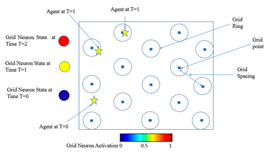 Each grid point is having a specific relation with all other grid points of the grid pattern. If we consider any of the grid points as a reference point and measures the distance of all other grid points along the x and y-axis direction from the reference point, then we obtain two categories of grid points. First are those whose distance along the x-axis is the integer multiple of the width of the hexagon, and distance along the y-axis is the 0.5 multiple of the height. Second, are those whose distance along the x-axis is the (odd number/2) multiple of width and distance along the y-axis is the (odd number/4) multiple of height. In case the agent’s measured distance from the reference point follows any one of the above categories of the grid points, then it shows that the agent is at one of the grid points and as a result of this the grid neuron will be fired or activated with the activation value of 1. There can be a possibility that the agent lies within the grid ring of a grid point instead of a grid point. In that case, the grid neuron will be activated but the activation would be less than one and will be inversely proportional to the distance from the center of the grid ring which equals (1-D/R) where D is the distance from the grid point under whose firing range the agent is present, and R is the radius of the firing range. The value for the activation will be zero when the distance D is larger than R.