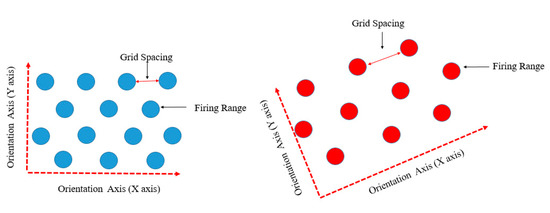 The neuron is like a bulb that turns on only when the agent comes within the firing range (grid ring); otherwise, it remains off. The firing locations constitute the hexagonal grid pattern. The firing intensity of the neuron inside the rings depends on the distance of the agent from the center of the ring. At the center, the neurons firing intensity will be the highest and vice versa. Each grid neuron possesses different orientations and spacing of firing locations. In Figure 2, the hexagonal grid pattern of different spacing and orientation is shown.