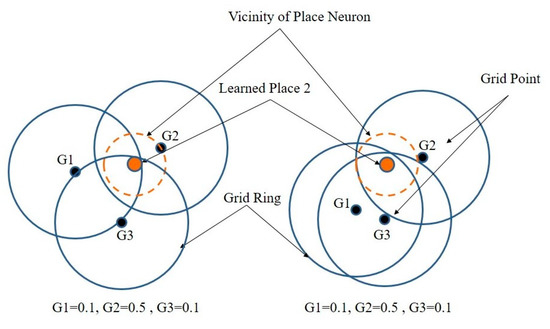 A place neuron can only be pseudo active when the agent enters the vicinity of a place neuron. The level of activation depends on the distance of the agent from the location of the neuron. Each place neuron calculates (for pseudo-activation) the match between their learned interference pattern with the agent’s current interference pattern as per Equation (6). The place neuron having the highest match will be the winner, and this winner place neuron recalls the distances of reference points and their activation values. The recalled values allow us to find their location with respect to all reference points of all grid neurons and then map the agent in the interference pattern to obtain their distance from the agent. Afterward, the place neuron will become pseudo active as per the Equation (7).