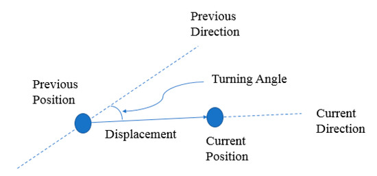 In the case of navigation, the entire body of an agent has been considered a unit. The agent movement is defined as the turning angle and the displacement, as shown in Figure 6. The turning angle is defined as the angle between the previous direction of movement and the direction of the current movement. The distance between the current and the previous location of the agent is defined as displacement.