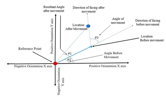 The calculation of the agent’s coordinate with respect to the reference grid point is shown below as Algorithm 1. The parameters used in the algorithm are illustrated in Figure 8. The parameter “” tells the rotation of the agent’s body in degree, “Direction” is the direction of movement, that is having two possible values, one is left another is the right, “” is the quadrant angle before movement and “” is the quadrant angle after movement.