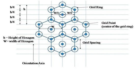 Generating a hexagonal grid like activation pattern needs to know the geometry of a hexagon which is shown below in Figure 9. In the figure, the distance between any two grid points sharing the same edge is of the same length, which is the grid spacing of a hexagon. There are two or more other parameters that describe the hexagon, which is the height and the width, whose calculations are shown in Equations (4) and (5). Parameters of the equations are illustrated in Figure 9.