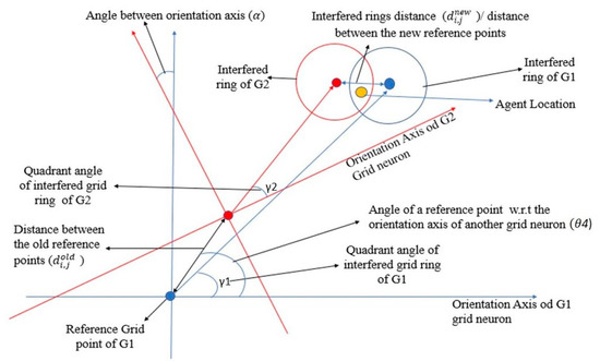 where, is the distance of the reference points of ith and jth grid neuron, is the calculated distance between the reference point of ith and jth grid neuron, and are the translated X and Y coordinate of jth grid neuron into the coordinate system of another grid neuron (i.e., i), and is the angle between the orientation axis of interfered rings.