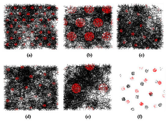 Output grid patterns of the quadrant model: (a) grid spacing of 15 units taken with the grid ring radius of 3 units; (b) grid spacing of 35 units with the grid ring radius of 10 units; (c) spacing of 25 units, radius 3 units and orientation of 30 degrees; (d) spacing of 25 units, grid ring radius is of 3 units and orientation of 10 degrees; (e) spacing of 55 units, and radius of 10 units; (f) Interference of two different grid patterns.