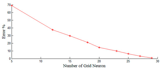 Self-localization gives information on the location of the agent in the internal representation of the environment. Afterward, the localization, an agent, performs prediction based on the current location and movement. If the self-localization gives an erroneous location, then it will directly affect the above-performed recognition task accuracy results. The self-localization is dependent on the number of grid neurons used because fewer grid neurons prone to ambiguity problem as a result of this wrong location can be predicted. The result for the self-localization accuracy is shown below in Figure 22 with the help of a line graph, where the vertical axis represents the error percentage, the horizontal axis represents the number of grid neurons.