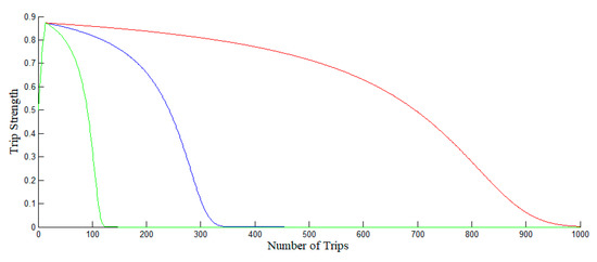 The memory space is managed efficiently by incorporating a trip-forgetting mechanism in the place sequence learner. The results are shown in Figure 23. In the figure, it has been shown that strength gains an increase in the occurrence of relevant trips and a decrease in the occurrence of irrelevant trips. The rate of decrease is inversely proportional to the strength that the trip has attained. As the graph illustrated, the memory strength decay with every new irrelevant trip. The decay rate of the memory strength will be higher at a lower strength and vice versa. Three different colored curves correspond to different emotion levels. The trip has a lower level of emotion while making a trip will have a higher decay rate and vice versa. In the graph, on a continuum of irrelevant trips, the forgetting rate is higher for a trip that has less memory strength and vice versa.