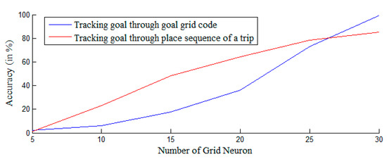 As far as accuracy is concerned, if the target grid code is far, then in case of tracking using goal grid code will be lower compared to using a learned trip for navigation. The results of the accuracy of both cases are shown in Figure 24, where the vertical axis representing the goal-tracking accuracy, and the horizontal axis represents the number of grid neurons used.