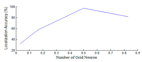 The larger grid spacing grid neurons are those that fire from 2–5 sites in an environment. The grid neuron fires at more than five sites are considered as smaller grid spacing grid neurons. We checked different numbers of smaller and larger grid neurons that are defined as a value, which is a ratio of the number of larger grid spacing grid neurons to the total number of grid neurons. The results for the localization accuracy with respect to the ratio value are shown in Figure 25. The figure has shown poor accuracy at lower ratio value. The poor accuracy is observed due to higher ambiguity in the smaller activation field size grid neuron. In a small activation region, the firing pattern repeats several times in an environment, so it fails to predict the correct sub-area in the environment. On a higher ratio value, the accuracy has reached to its optimum level. The reason behind the optimal accuracy is the correct prediction of the sub-area by the larger grid spacing neurons and the correct location in the sub-area by the smaller grid spacing grid neurons. On the further increase of the ratio value, the accuracy has decreased from the optimal level but not much compared to the lower ratio value. The reason behind this phenomenon is the large grid spacing grid neurons. The large grid spacing neuron predicts the correct sub-area but fails to locate the correct location in a sub-area. Finding the correct location in a sub-area is the task of smaller grid spacing neurons.