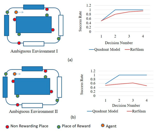 The proposed model has outperformed the RatSLAM [17], as depicted in Figure 26, where there were compared in two ambiguous environments. In the first ambiguous environment, on the first sensory input, the model has recalled two different places. That is why the model is confused in the very first decision, and it has chosen randomly one from the two. It results in a poor success rate of around 0.5 in the first decision. However, as it missed the reward due to the first wrong decision, the model has resolved the confusion, and one true place is activated. Thereafter, the only active correct place neuron will activate the correct neuron on path integration so the agent will only make the right decision. On the other hand, the second environment, which is highly ambiguous despite the fact that the model has resolved the confusion using the trip sequence learner (it is an episodic memory). It can store the grid code of the places along with the event activities, which helps in recalling the decisions. Even in the second environment, the first decision is filled with ambiguity, but later the agent resolves the ambiguity using the location sequence learner so that further decisions are all correct.
