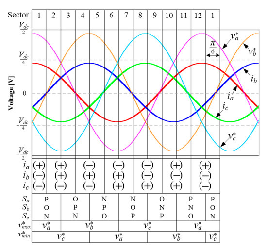 Figure 2 shows sectors, input current polarity, switching states and maximum and minimum reference voltages of the three-phase NP rectifiers operating with unity power factor, where and represent the maximum and minimum values of three-phase reference voltages, respectively. As shown in Figure 2, the voltages, and , change every 120°. Furthermore, the rectifier changes the switching state every 60° on the basis of the position of the reference voltages and (24). It can be known that the rectifier selects six switching states as shown in Figure 2, PNO, PON, OPN, NPO, NOP and ONP, according to (24). In addition to the reference voltage for the reference current tracking in (22), a new reference voltage proposed in this paper is defined with an offset voltage injection as