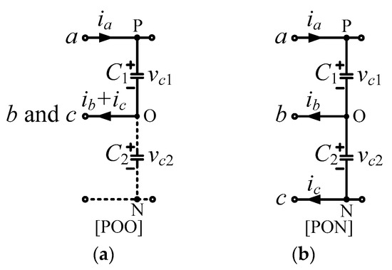 Therefore, when , meaning injecting the offset voltage higher than zero satisfies (21). Figure 3a,b show the capacitor current flow when the switching states are (POO) and (PON). In Figure 3a, the current flows only to the upper capacitor. Thus, the associated capacitor is charged. As shown in Figure 3b with , the upper capacitor charges. Thus, the new switching states after injecting the positive offset voltage in the sector 1, when the voltage difference is lower than zero, can reduce the voltage difference by increasing the upper capacitor voltage, which can maintain the capacitor voltage balance.