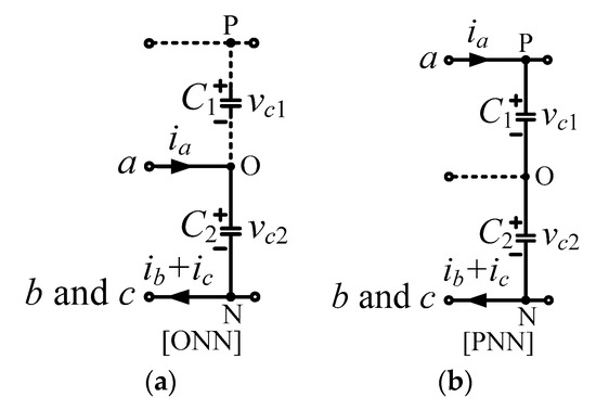 Therefore, if the negative offset voltage is injected when the voltage difference , meaning the new switching states generated after the offset voltage injection satisfies (21). Figure 4a,b show the capacitor current path with the switching states (ONN) and (PNN), respectively. As shown in Figure 4a, the lower capacitor is charged by the current flowing and the voltage is increased. As a result, the voltage difference , which was greater than zero, can be reduced, leading to the capacitor voltage balancing. Figure 4b shows the switching state (PNN), and the capacitor voltage does not change because no current flows through the neutral point, which gives no harmful effects on the capacitor voltage balancing.