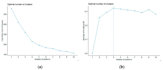 In this step, the goal is to determine the optimal number of clusters suitable for k-means cluster analysis. It is advisable to use more methods for this purpose, i.e., the Elbow and Silhouette methods in particular (Figure 1). The procedure consists in performing decompositions for different numbers of k-clusters. A value of total within sum of square is calculated for each decomposition (in Elbow method Equation (3)) and Silhouette coefficient (Equation (1)). Using the k-means algorithm, we divide the data sequentially into two to ten clusters and construct the corresponding function of the number of the clusters. In this case, there is a steep bending in four clusters (Figure 1a). In the case of the Silhouette method, the analysis is performed similarly, obtaining the optimal number of clusters based on the maximum value of the coefficient (Figure 1b). Both methods choose four clusters as the best solution for k-means clustering.