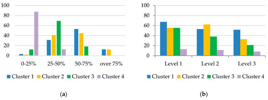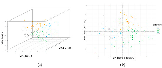Figure 3b shows a more detailed resolution of each index level. Cluster 4 has low VPi4 index value at all levels; Cluster 3 has low VPi4 index value at the first two levels, in particular; and Clusters 1 and 2 have a decent rating at all the levels of the index. The distinction between Cluster 1 and Cluster 2 is subjected to further analysis with regard to the similarity of the VPi4 index level.