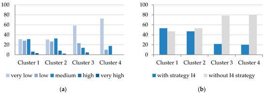 Characteristics of clusters, based on subjective assessment of Industry 4.0 (I4): (a) subjective assessment of Industry 4.0 implementation by enterprises (very low, low, medium, high, or very high implementation of I4) and (b) clusters according to the existence of I4 strategy in enterprises.