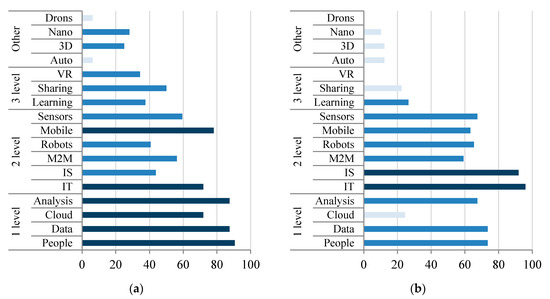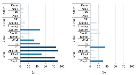 Figure 5. Clusters’ characteristics: (a) Cluster 1—I4 technological enterprises; (b) Cluster 2—I4 advances enterprises.