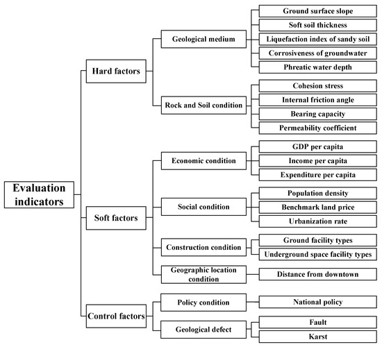 For analyzing the indicators utilized for UUSR evaluation, it needs to be considered from three aspects, including combining the extant indicators system for different objects; measuring the impact of urban geological types, the size of the evaluation scale, and the difficulty of data acquisition from the perspective of total factor evaluation; and integrating with the dynamic change characteristics of evaluation indicators. Following the principles of scientific nature, systemic nature, temporal nature, the nature of scale, and the nature of easy accessibility, evaluation indicators of UUSR comprehensive quality are determined, including hard factors, soft factors, and control factors, as seen in Figure 1. Among them, soft soil thickness, liquefaction index of sandy oil, and distance from downtown are negative indicators, and the others are positive indicators.