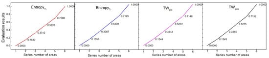 As shown in Figure 2, since the virtual construction data of area 1 to area 6 shows a monotonically increasing trend, the evaluation results of area 1 and area 6 are 0 and 1, respectively, because the data are standardized by using the extreme value method. Meanwhile, the evaluation results of areas 1, 2, 3, 4, 5, and 6 increase monotonically, and have strong consistency and nice calculation effects, when the UUSR evaluation is carried out by using the same weighting method, regardless of the entropy weight method or the E-TW model, which includes the time weighted preposition method and time weighted postposition method. The entropy weight method is a recognized method used in UUSR evaluation. In view of the similar consistency and calculation effect, it is reasonable for the E-TW model to be utilized in UUSR evaluation.