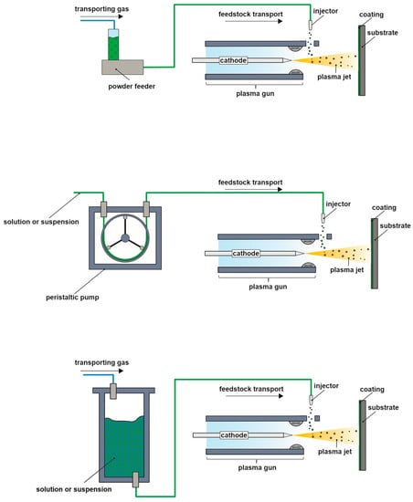 The composition of deposited coatings changes the initial feedstock []. This change is easy to carry out in SPPS technology. Consequently, it is possible to enlarge the area of thermal spray applications []. Another important technological advantage is the possibility of using conventional plasma spray equipment. Also, the solution feeder in SPPS can be the same as suspension feeder in SPS technique [].