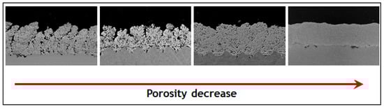 - Coatings may be extremely porous (even more than 50 vol.%) or very dense (1–2 vol.%) [,,], depending on the phenomena occurring in the plasma jet (see Figure 6);