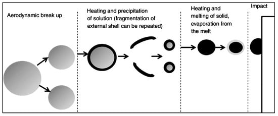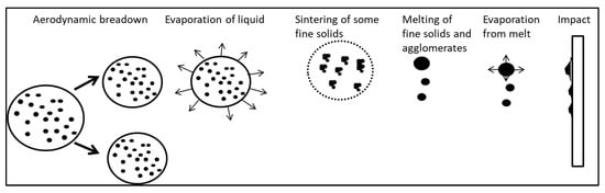 The phenomena occurring at SPPS process are shown in Figure 7. More details about these phenomena as well as interactions between droplets and plasma jet can be found in [,,,,,,,].