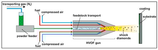 HVOF (high velocity oxy-fuel) and similar processes such as HVAF (high velocity air fuel) (see Figure 8) or HVSFS (high velocity suspension flame spraying) use gas combustion as energy sources for melting and accelerating powder particles. The HVOF process enables reaching higher particles velocity and lower particle temperature than APS. Consequently, the process is characterized by high deposition efficiency, good adhesion of coatings, which have low content of oxides and low porosity []. In spite of relatively low deposition temperature, the thermal stresses are still present in the deposited coatings. This is the main reason for applying functionally graded coatings, FGC []. The FGC enables gradual change in coefficient of thermal expansion (CTE) and in Young’s modulus which decreases stress level and increases bond strength. The FGC are particularly useful in reducing thermal stresses in thick deposits []. Hardness and ductility are the HVOF coatings properties which are often tailored to avoid the brittle breakup of coating’s spallation []. The FGC may be obtained by: (i) using premixed powders or (ii) co-injection of different powders [,].