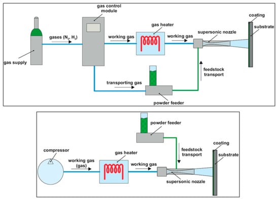 The high kinetic energy at impact with substrate results from very high particles velocity. The particles are accelerated by working gas, as nitrogen, helium, or air, to reach the supersonic velocities. The working gases are pushed through de Laval type nozzle of the gun. The initial pressure of working gas enables categorization of cold spraying method as: (i) high pressure cold spraying, HPCS (gas pressure > 1 MPa); and, (ii) low pressure cold spraying, LPCS (gas pressure < 1 MPa). HPCS (see Figure 9) uses usually nitrogen or helium as the working gas. A stream of carrier gas passes through a powder feeder and transports powder to the gun. The powder is injected axially into the gun’s nozzle. The working gas is heated before reaching the nozzle. The heating leads to an increase of the powder particles temperature which favors plastic deformation of particles upon impact. LPCS (Figure 9) operates with nitrogen or air supplied by a compressor. The gas is also heated prior to arriving to the gun. The powder is injected radially to the gun’s nozzle. The LPCS installation is much cheaper in equipment price and processing costs than the HPCS one []. On the other hand the sprayed particle reaches much lower velocity than that in HPCS installation. Therefore, the application of LPCS is significantly limited to deposit the easy-plastic-deformable materials such as tin, zinc, copper, aluminum, and nickel. The deposition of composites as the cermets is also possible and becomes increasingly frequent [].