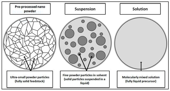 One of the serious limitations of conventional, powder-based, thermal spray technologies is the processing of fine powders. Small particles of low density materials are difficult to inject into high-energy jet or flame [,]. This means that obtaining submicro/nano-grained coatings is also limited. In order to overcome such problem, the innovative idea of using suspensions instead of dry powders, was patented by Gitzhofer et al. in Sherbrook University, Canada, in 1997 []. The patent describes that fine solids may be mixed with appropriate solvent (usually water or/and ethanol) and shows the chemical agents necessary to formulate a stable liquid feedstock.