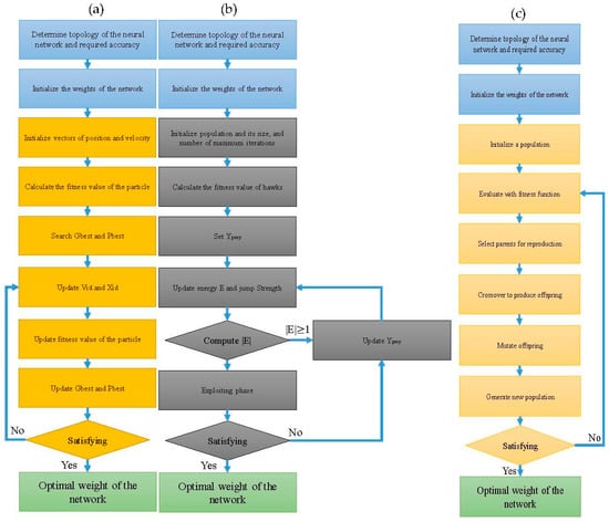 Flow chart of the hybrid algorithm of (a) ANN-PSO (ANN with particle swarm optimization), (b) ANN-HHO (ANN with Harris hawks optimization), and (c) ANN-GA (ANN with genetic algorithm).
