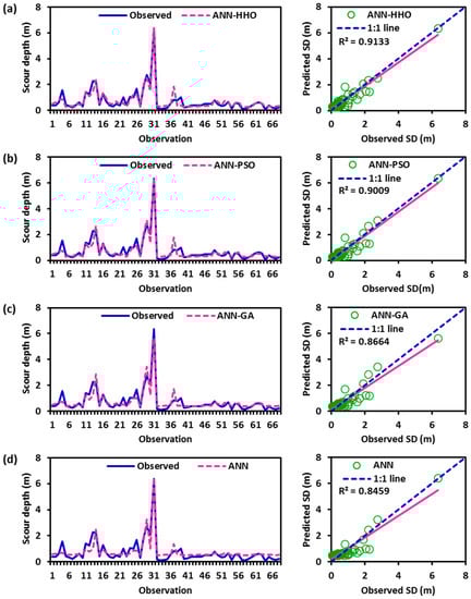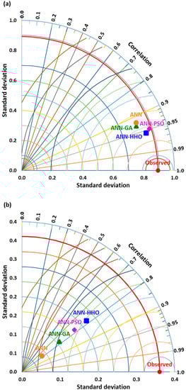 Besides, the Taylor diagram [66], which is a consortium of standard deviation, RMSE, and the correlation coefficient, was employed to display the spatial variation of predicted scour depth by the ANN-HHO, ANN-PSO, ANN-GA, and ANN models over the observed one in single topology, as illustrated in Figure 7a,b. It can be seen from Figure 7a,b that the outcomes obtained by the ANN-HHO model are close to the observed one for SD prediction, showing superior performance of this model as discussed earlier in Table 4 and Figure 4a–d to Figure 5a–d.