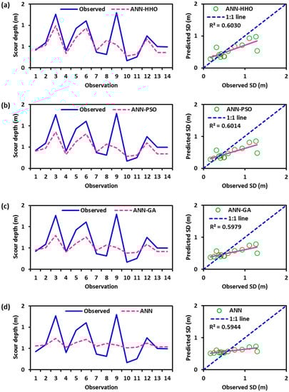 Line and scatter plots of (a) ANN-HHO, (b) ANN-PSO, (c) ANN-GA, and (d) ANN models during the testing period.