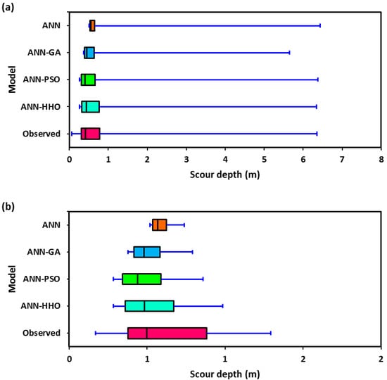 Box plots of observed and predicted scour depth by ANN-HHO, ANN-PSO, ANN-GA, ANN models during (a) training, and (b) testing periods.