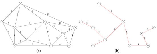 Illustration of weighted graphs. The graph on the right depicts an MST of the graph on the left. (a) weighted graph; (b) MST.