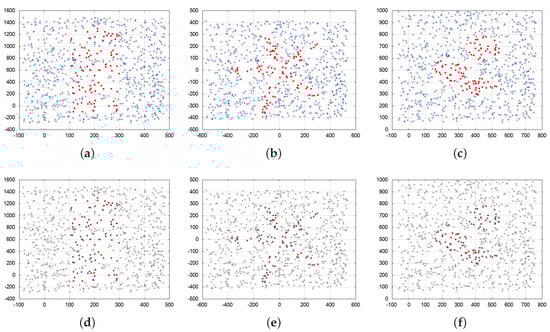 Scatter plots of the synthetic data sets with 0% and 70% of noise (points in gray color are for noisy data). (a) subclus-0; (b) clover-0; (c) paw-0; (d) subclus-70; (e) clover-70; (f) paw-70.