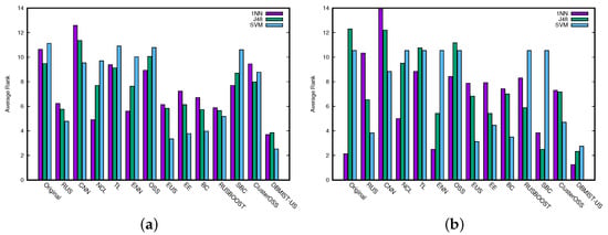 Figure 3 displays the average Friedman rank of the under-sampling algorithm for each classifier. From these graphs, one can observe that DBMIST-US achieved the lowest average ranks regardless of the classifier used, which means that this method performed the best on both the real-life data sets and the synthetic data sets. In addition, as expected, under-sampling the data leads to an improvement in the classification performance, except when using the CNN algorithm; in general, this showed the highest average Friedman ranks (i.e., the worst performance as measured by the geometric mean), especially with the 1NN and J48 classifiers.