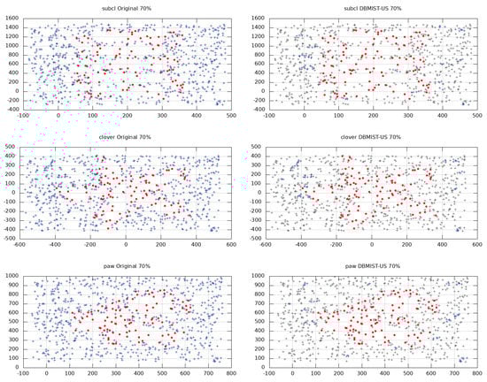 Regarding the differences between DBMIST-US and the existing clustering-based methods, it is worth pointing out that most under-sampling techniques rely upon the K-means and the fuzzy K-means algorithms [,,,,,,,,]. However, it is well-known that K-means may not be sufficiently effective when applied to imbalanced data because it always generates clusters with similar sizes []. Another weakness of these clustering algorithms is that they assume some prior knowledge of the number of clusters to face the imbalance problem. To overcome these shortcomings, our proposal employs the DBSCAN algorithm in the filtering stage. Some of the advantages of using DBSCAN are: (i) it can identify arbitrarily shaped clusters and detect noise, and (ii) the number of clusters is not a user-specified parameter. In addition, an MST-based approach is used to under-sample the majority class, which, to the best of our knowledge, this is the first development using the MST to face the imbalance problem. A related approach employs the Gabriel graph and the relative neighborhood graph to search for neighbors in SMOTE [], which are supergraphs of the Euclidean MST.