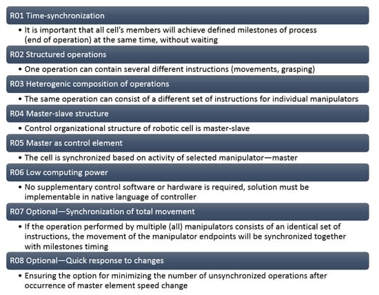 Various methods of synchronization and control of individual production operations and processes are currently used. It is necessary to differentiate whether these are autonomous mobile systems or manipulators and what usage is expected of them. Many published works deal with the synchronization of mobile platform activities. Rubenstein et al. [10] offer a solution for the synchronization of a large group of mobile robots as an open-source, low cost robot, designed to test collective algorithms on hundreds or thousands of robots accessible to robotics researchers. This solution allows for easier testing of algorithms designed to control robot groups because these control algorithms, due to their cost, time, and complexity, are confirmed only through simulations. Popular synchronization methods are also based on the observation of nature, for example, fireflies as presented by Werner-Allen et al. [11]. A modification of this approach is intended to operate on systems that use a communication channel where contention and delays are possible. In addition, the coordination mechanisms that enable the execution of cooperative tasks with modular robotic systems are presented in the contribution of Baca et al. [12]. They describe the implementation of a tight cooperation strategy through Intra M-Robot communication based on a closed-loop discrete time method and the remote clock across the robot configuration enables proper coordination inside the colony.