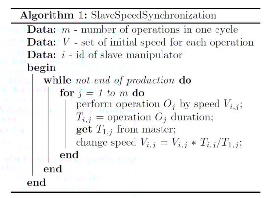 In this study, an algorithms for the time synchronization of operations performed by a heterogeneous set of robotic manipulators grouped into a production cell was proposed, validated, and implemented. The organizational structure of this robotic cell control was realized as master–slave without an external control element. Communication in the cell was provided by a TCP/IP channel via sockets. The proposed problem solution requires minimal computational power due to an empirically oriented approach. We relied on our wide empirical knowledge and experiences in process algorithmizing, as well as on various previously implemented tasks in the field of robotics or the modeling and visualization of processes. This approach enabled the solution to be processed directly by the control unit of each participating element of the robotic cell with utilization of standard instructions in their native language. The main aim was to dynamically adapt the movement speed of slave manipulator endpoints to the master manipulator activity. Therefore, the algorithms ensure the defined milestones of the production cycle of each robotic manipulator in the cell are attained at the same time, while all operations may include various sets of different motion or manipulation instructions.