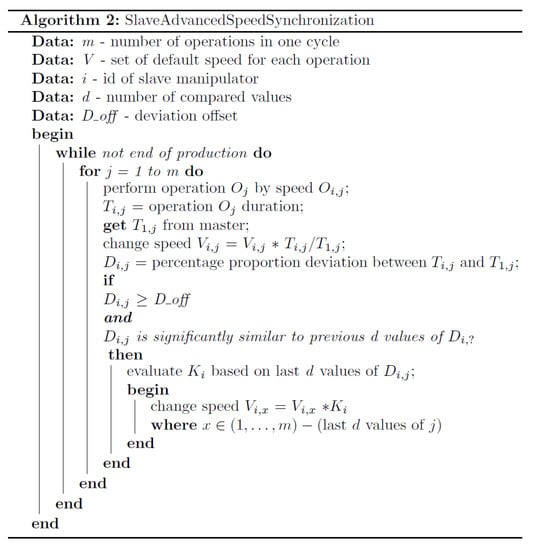 Both algorithms were designed for (theoretically) endless repetition of production cycle. The above-mentioned previous values of the current Di,j in the initial steps of every cycle are based on an endless loop of variable j. For example, in the case of 10 operations in one production cycle, after the initialization cycle, the previous two elements V2,j (endpoint speed of slave manipulator M2) to element V2,1 are V2,10 and V2,9.